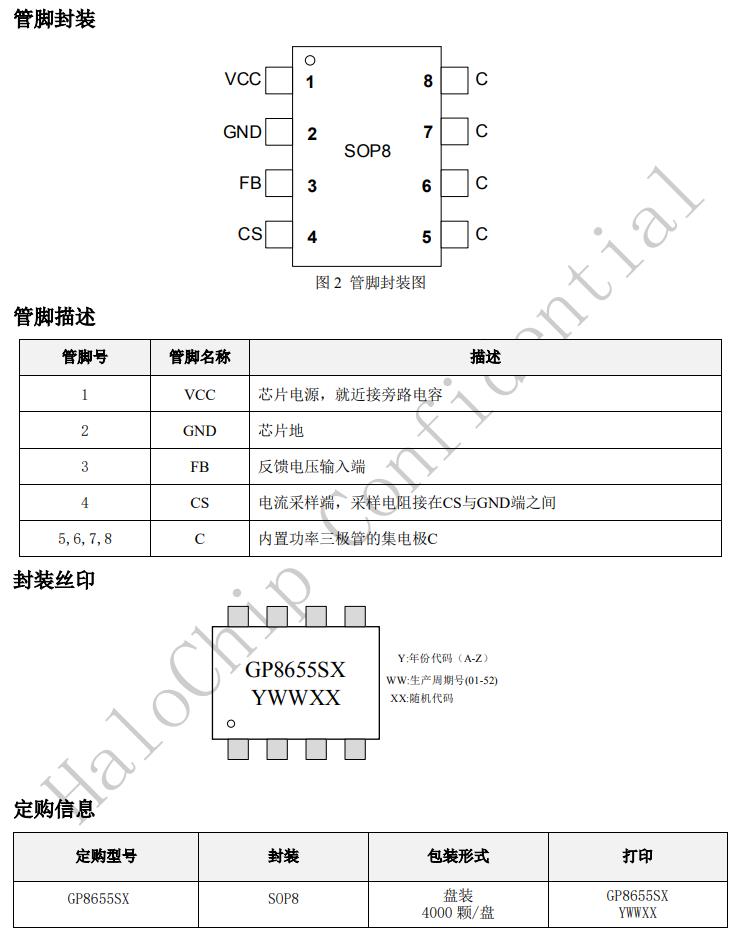 GP8655SX具有多重保護(hù)功能,包括開路保護(hù),過壓保護(hù),短路保護(hù)等功能。GP8655SX采用SOP8封裝